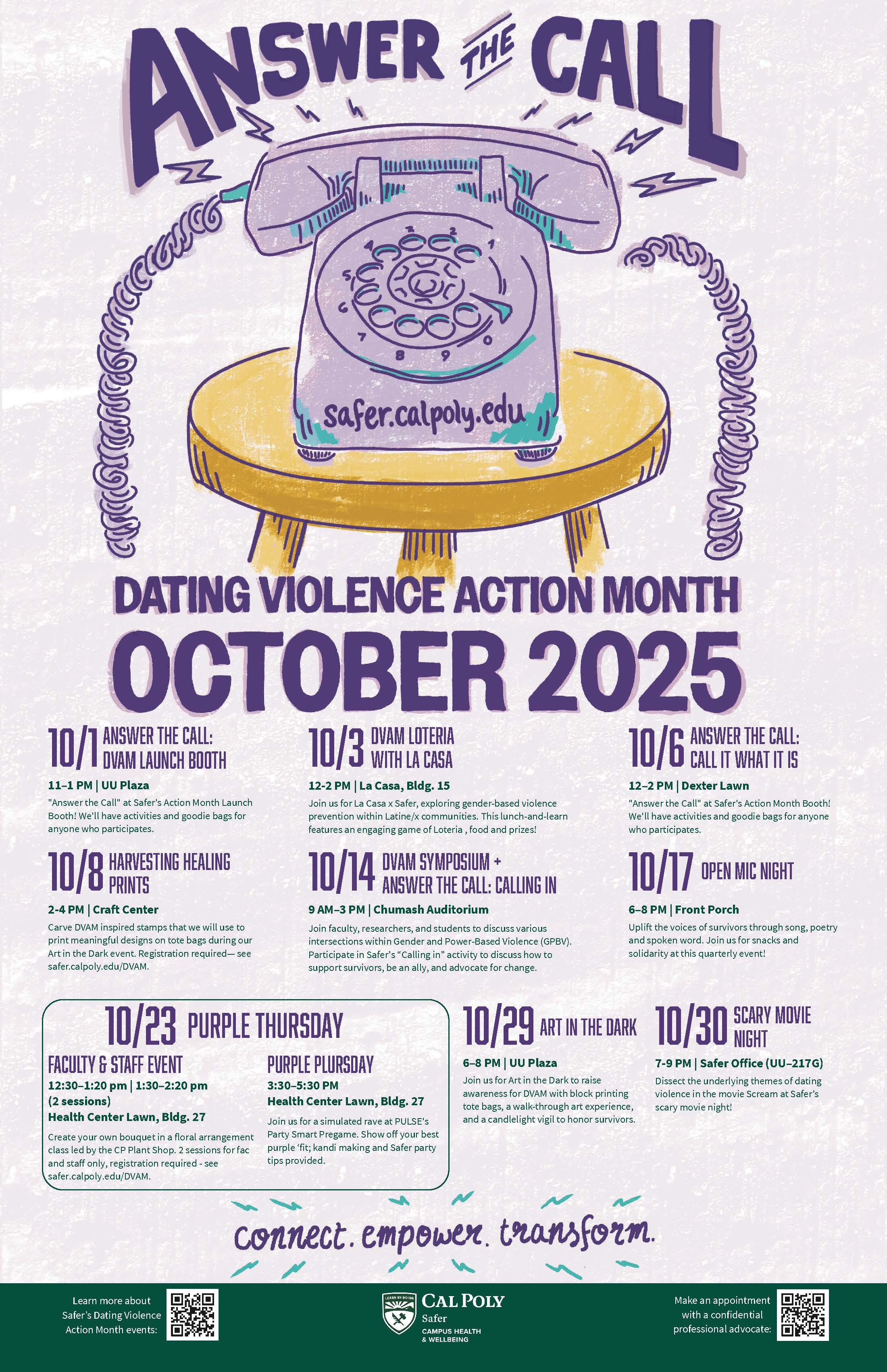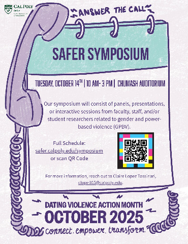This year, the Dating Violence Action Month theme is: “Answer the Call. Connect. Empower. Transform.” This highlights our collective responsibility to end the silence surrounding dating violence and emphasizes that every voice makes a difference and every connection makes a change. Please see the flyers below for more information on Safer's Symposium 2025 and more events this October.