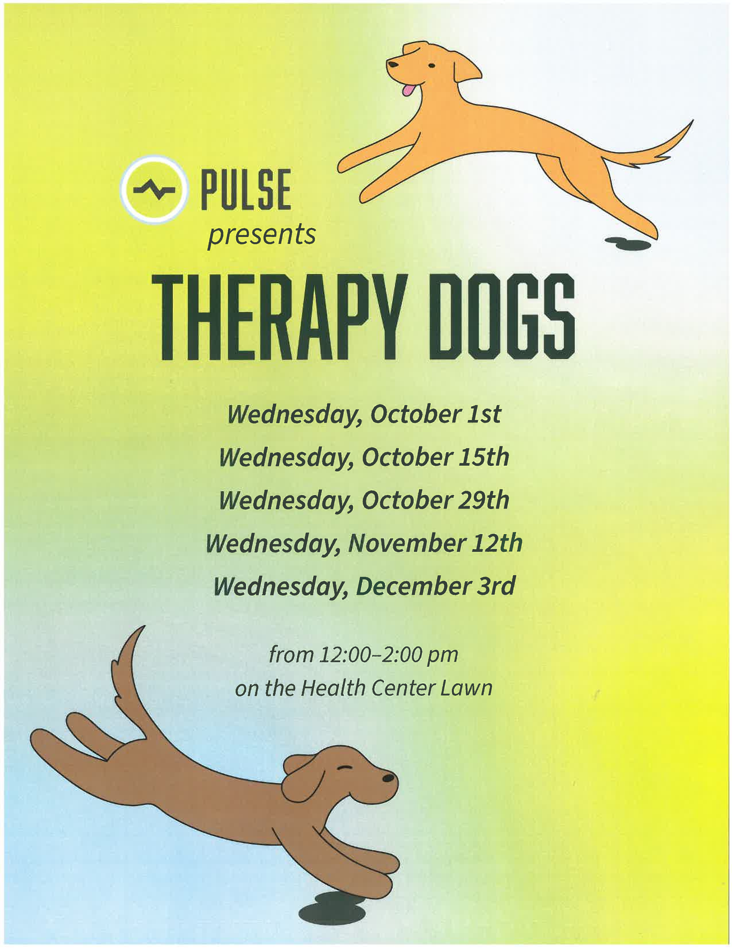 Campus Health and Wellbeing's student-led health education program, PULSE, presents Therapy Dogs on Dexter Lawn! Please see the flyer below for more information on upcoming dates.