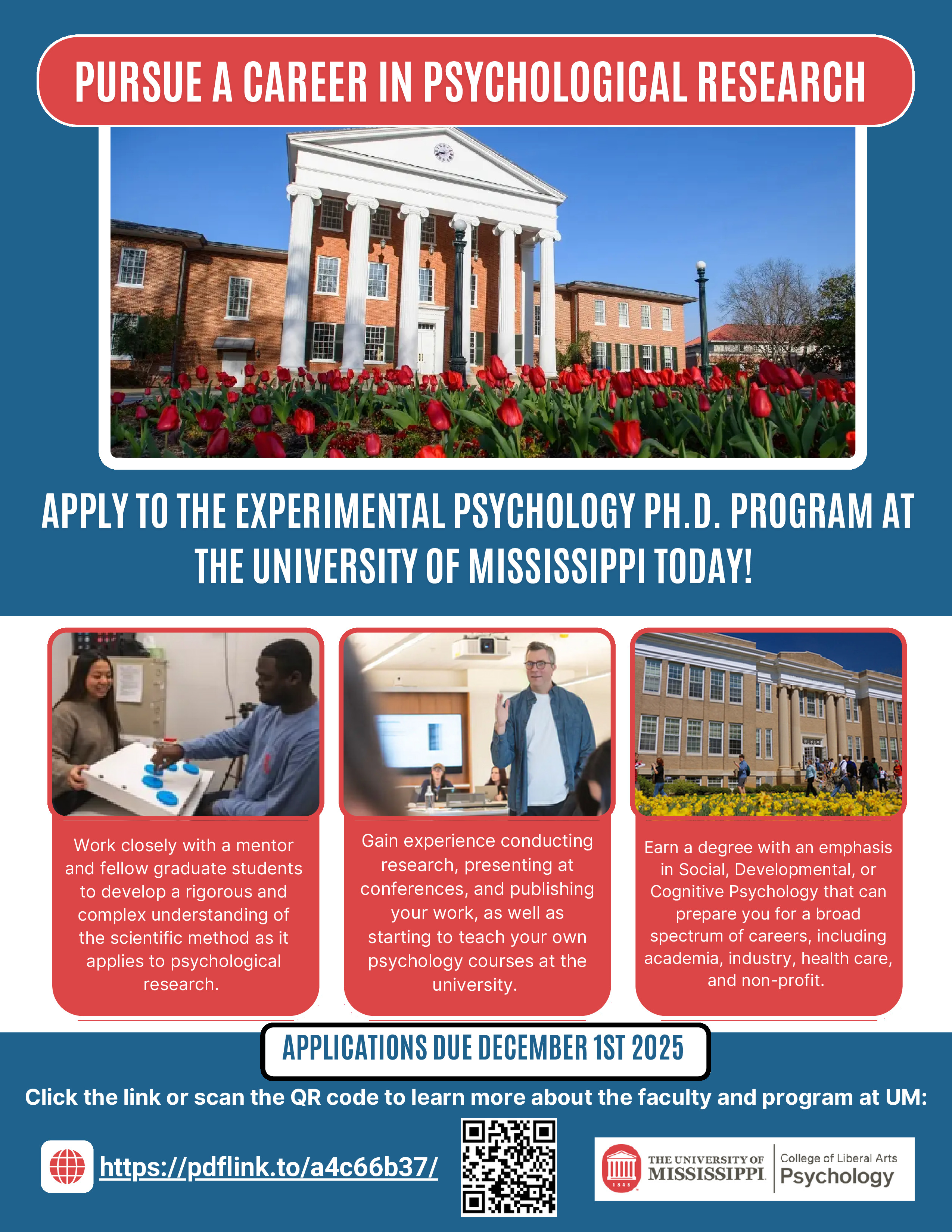 The University of Mississippi is recruiting talented students who are interested in experimental training in Cognitive, Developmental, and Social Psychology. This program prepares students for both academic and non-academic positions. Please see the flyer below for more information.