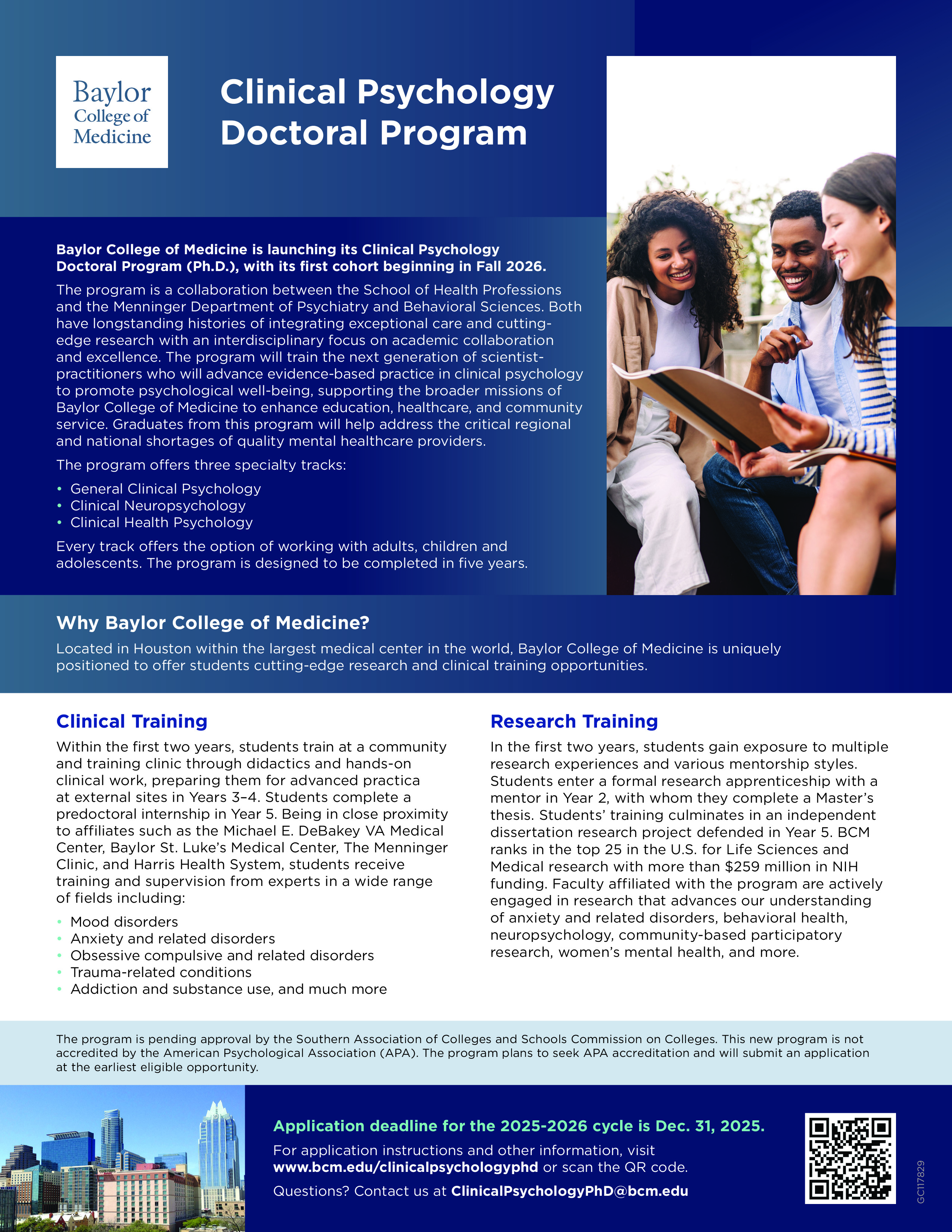 Baylor College of Medicine is starting a new Clinical Psychology Ph.D. Program and is now accepting applicants for the inaugural class starting Fall 2026. Application deadline for the 2025-2026 cycle is December 31st, 2025. Please see the flyer below for more information.