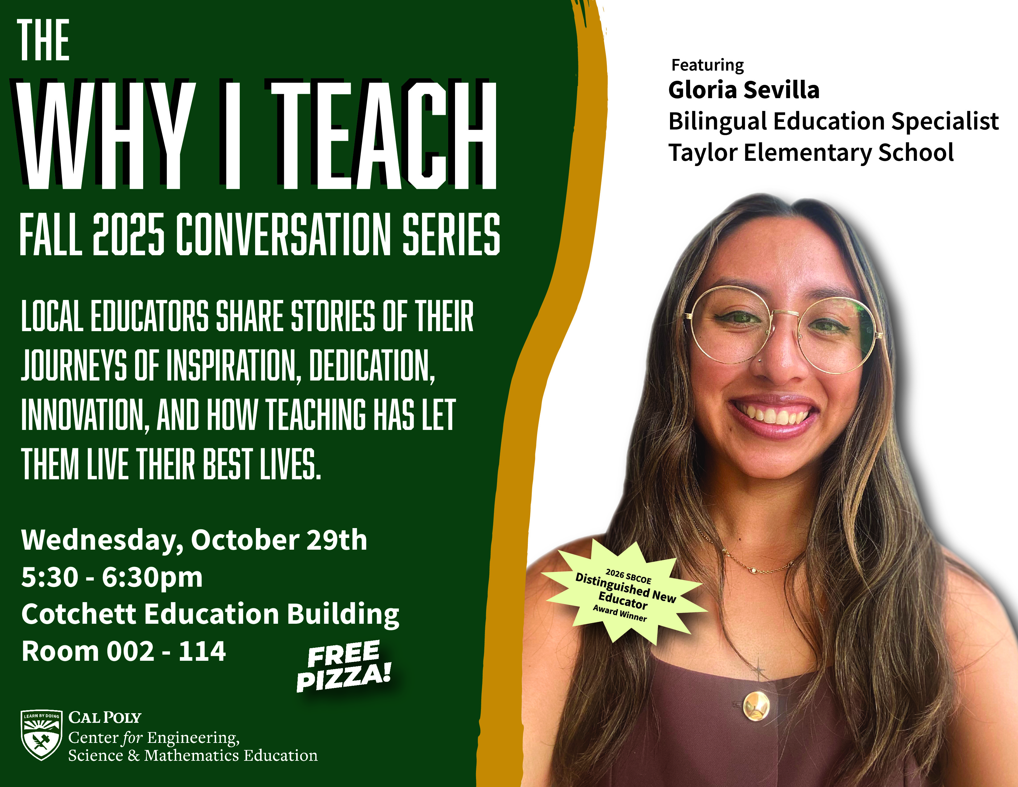 Please join the Cal Poly CESAME and the Cal Poly School of Education on Wednesday, October 29th, from 5:30 – 6:30 PM in the Cotchett Education Building, Room 02-114, for an inspiring evening of conversation, connection, and community. Free pizza will be provided. Please see the flyer below for more information.