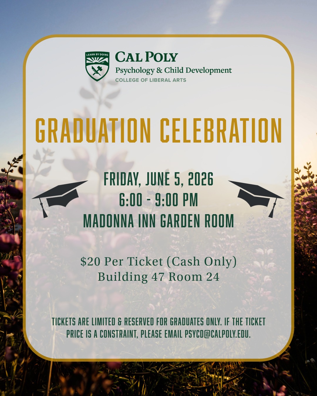 Tickets are limited and reserved for graduates only. If the ticket price is a constraint, please email psycd@calpoly.edu.