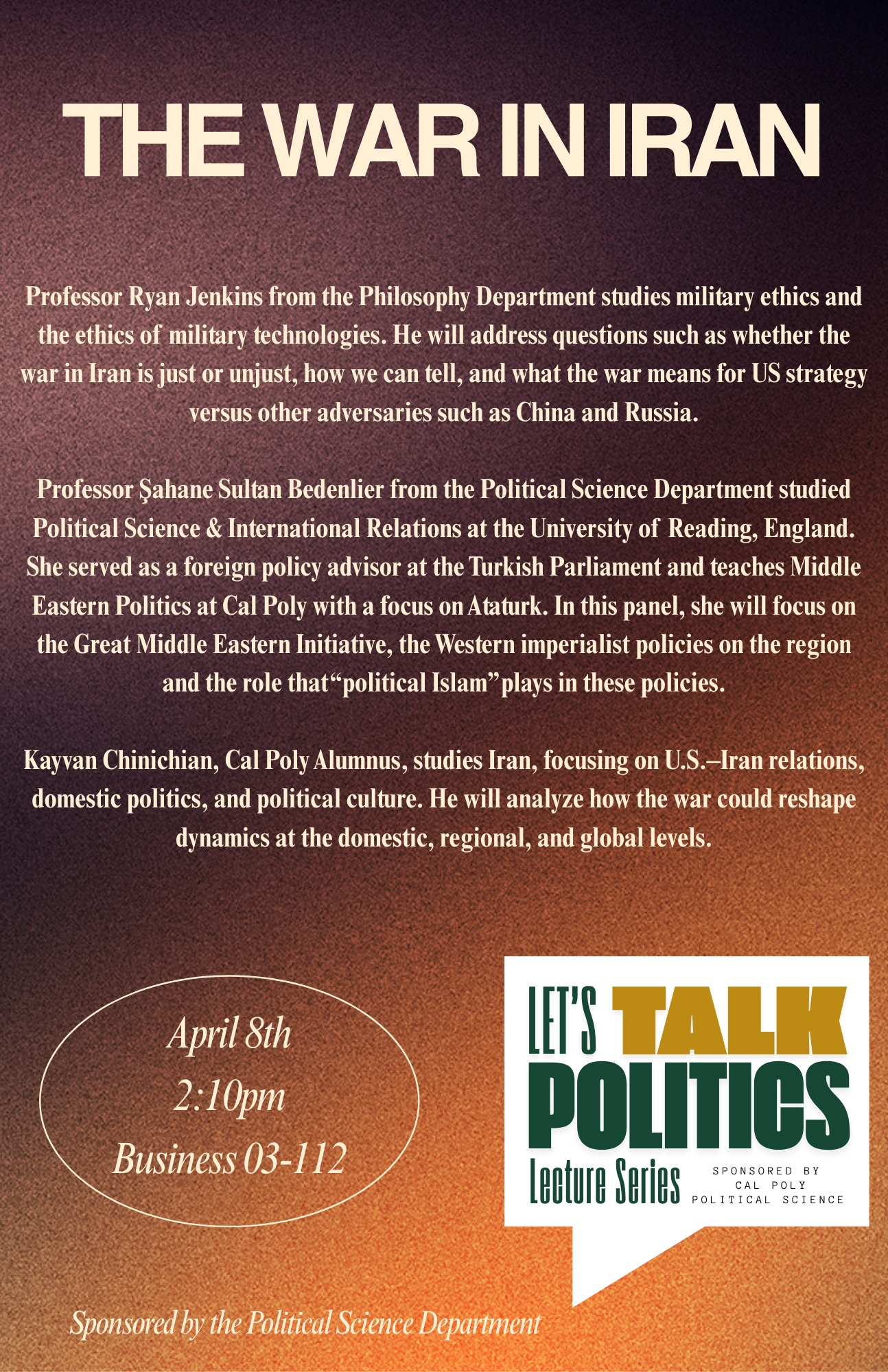 Join Zoom Meeting: https://calpoly.zoom.us/j/9633077189?omn=85408816181