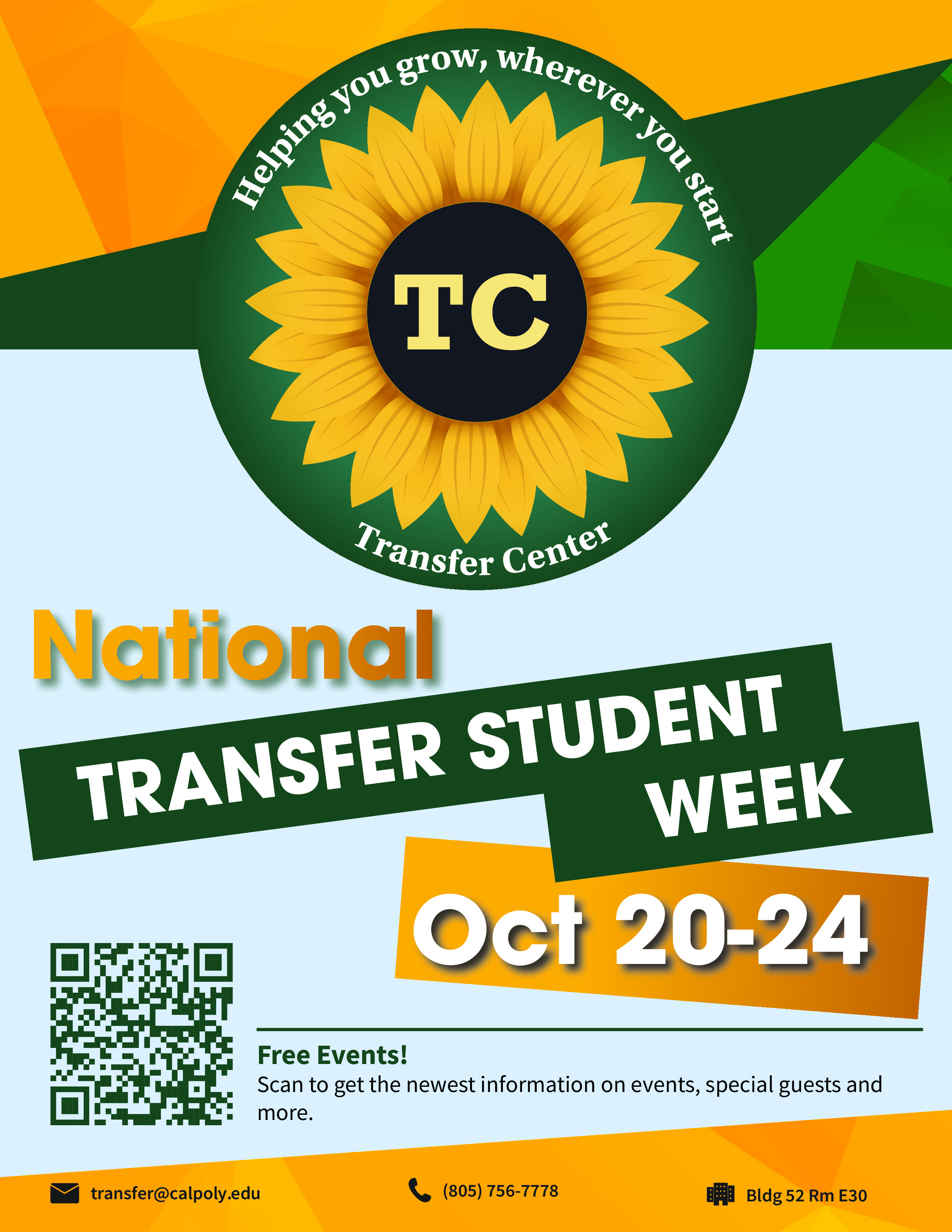 The Transfer Center invites you to celebrate National Transfer Student Week next week from October 20th-24th. Free events all week long! For more information, please visit the Transfer Center website and check out the flyer below!