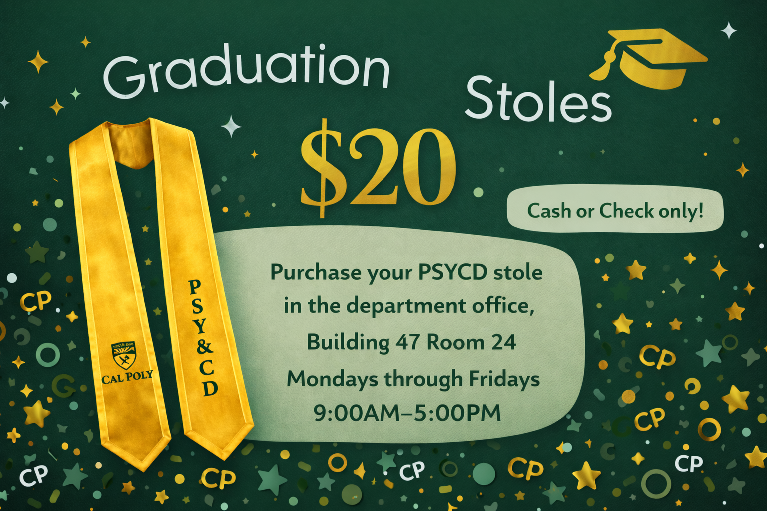 Congratulations Class of '26! If you choose, you may purchase a PSYCD graduation stole from the department office on Mondays-Fridays during business hours.